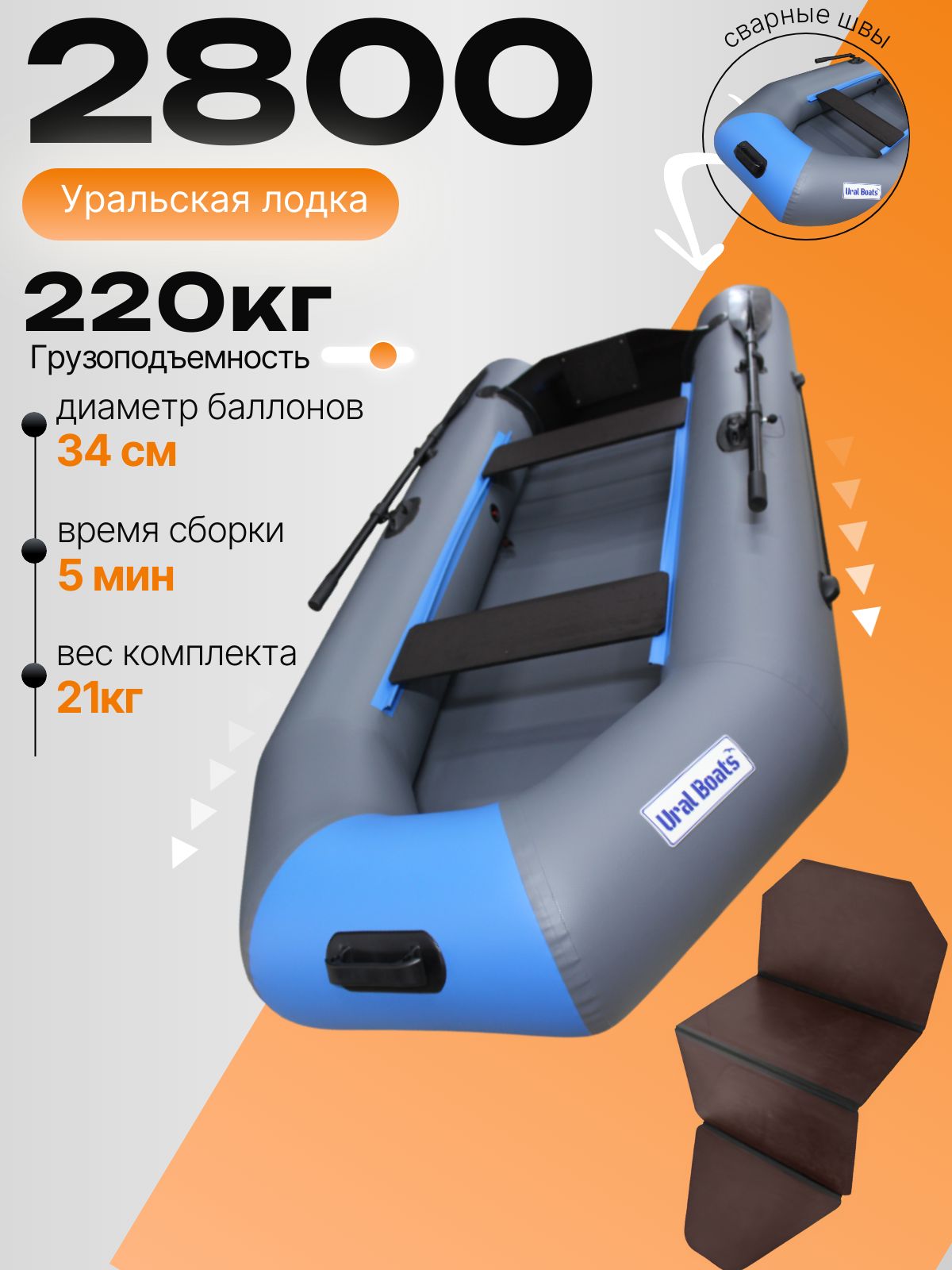 Уральская надувная лодка ПВХ 2800МЭ/слань плотность 750гр.